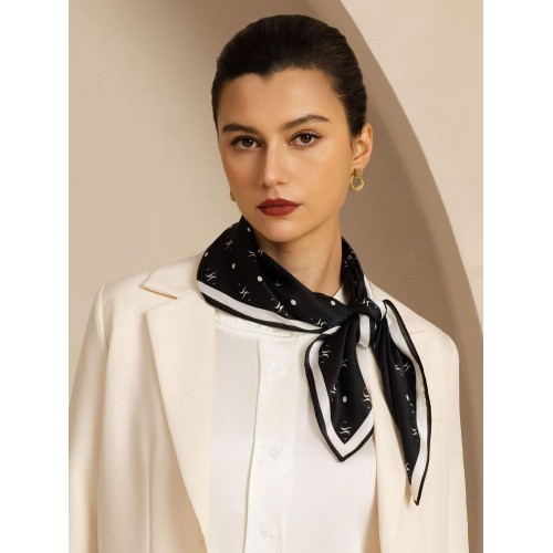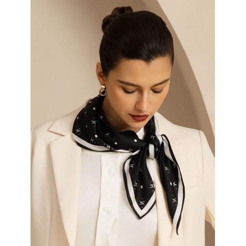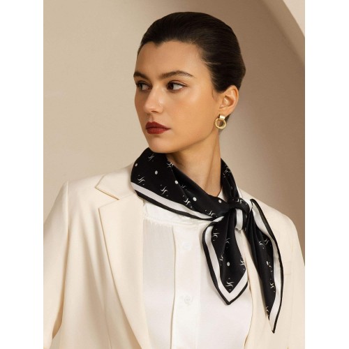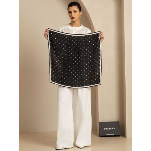 Crafted from 100% pure silk. this scarf offers a smooth texture and luxurious sheen. Featuring a classic black base with intricate white prints. it adds sophistication to any outfit. Perfect for casual wear. business attire. or evening events. this versatile accessory can be styled as a neck scarf. bag accessory. or headscarf. Silksilky is known for its exceptional craftsmanship and premium silk. ensuring top quality and durability.